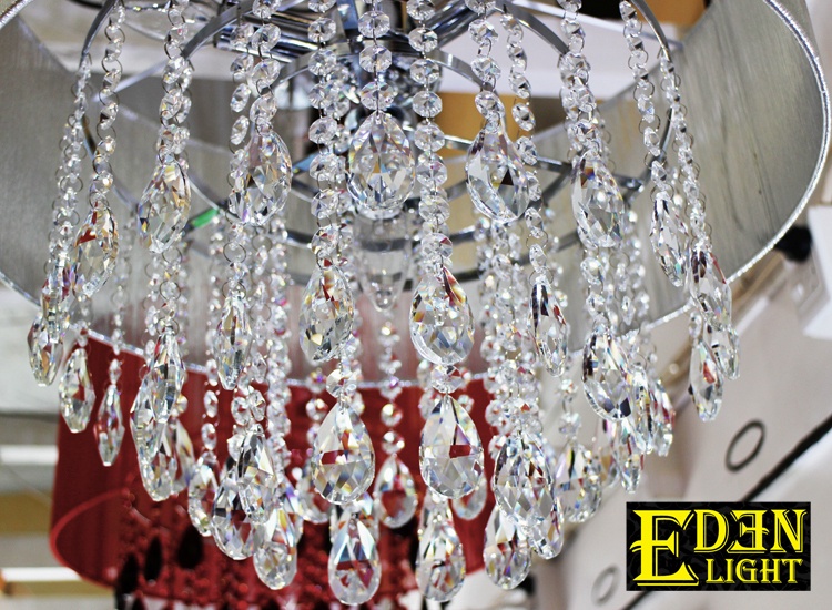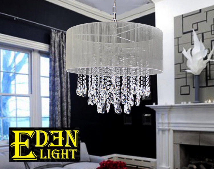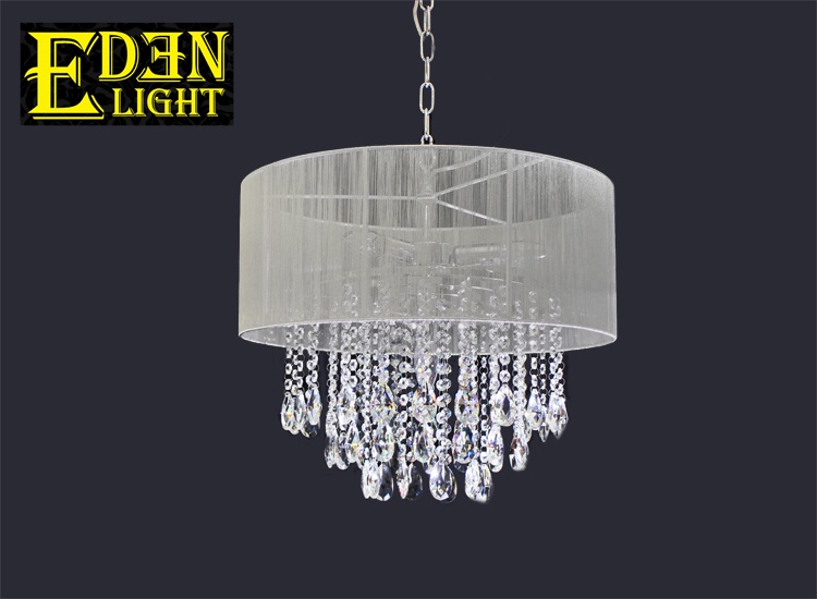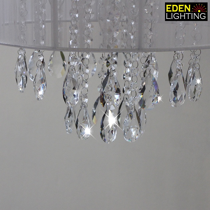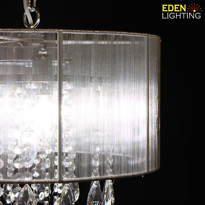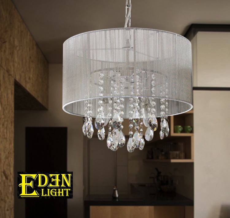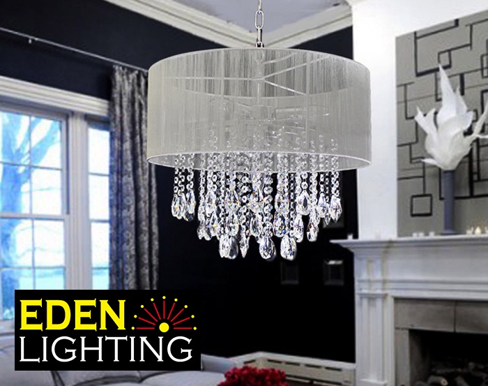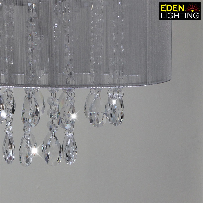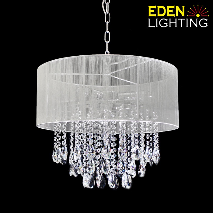 A contemporary styled chrome chandelier enclosed with Elegant hand wrapped Egyptian weaved fabric shade, polished chrome finish and high grade clear crystal drops. The Chandelier suits modern interiors and traditional interiors with contemporary furniture and artwork. Available in two sizes and three colours. Choose from 400mm or 500mm, coloured in black, white or silver.