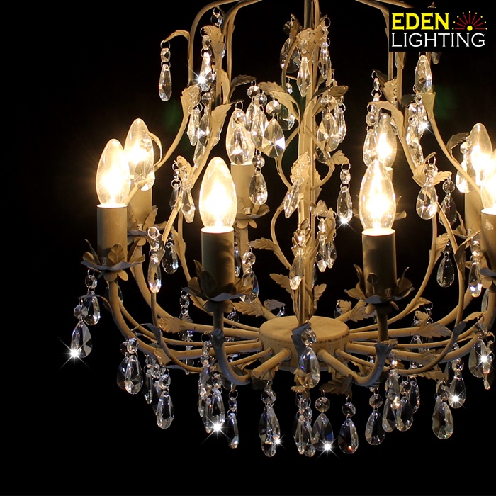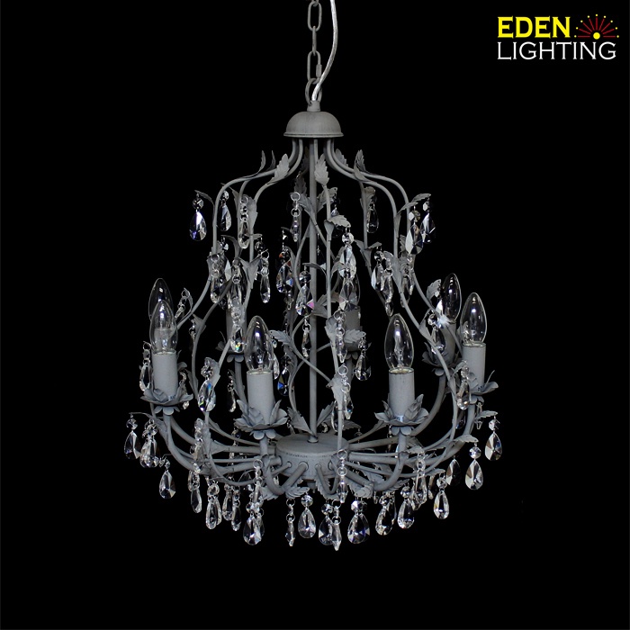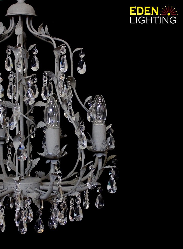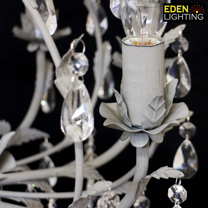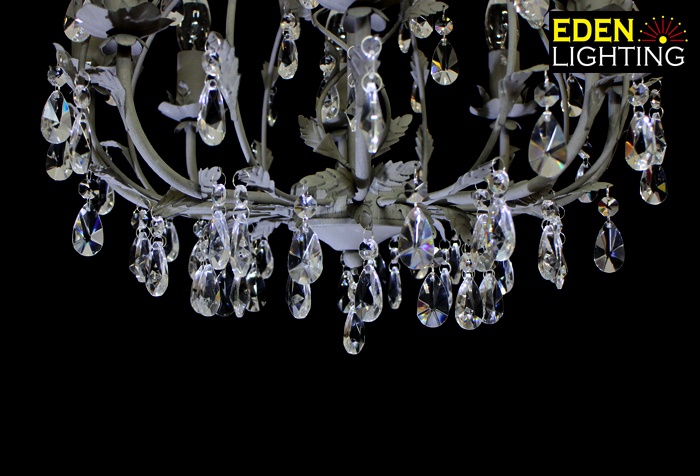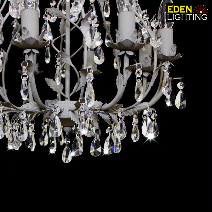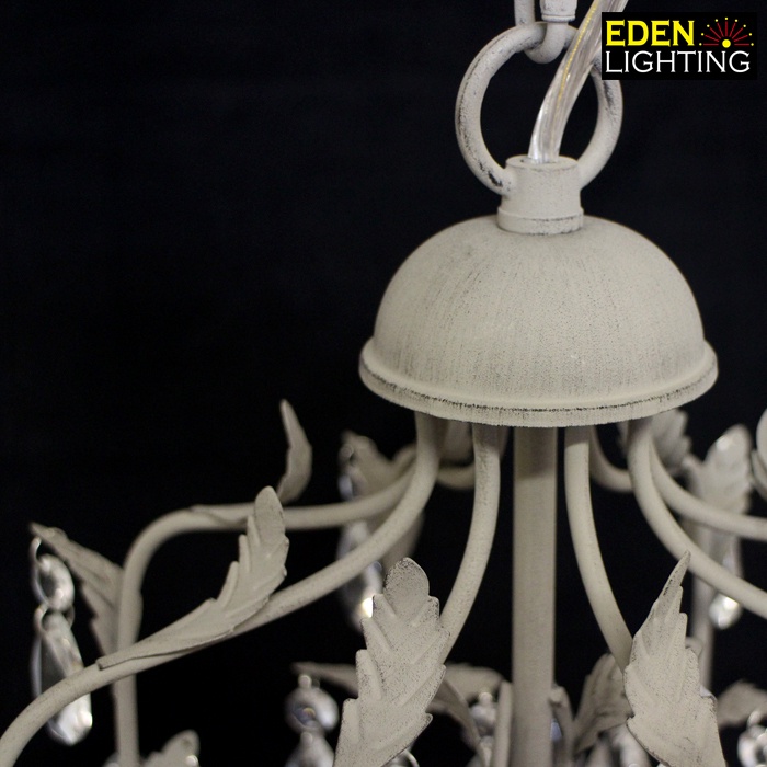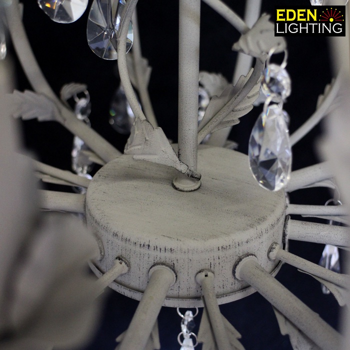 This European style chandelier will make your house a castle. Top quality crystal drops and iron leafs pattern. Available in 3 and 5 lights versions, Available in white .