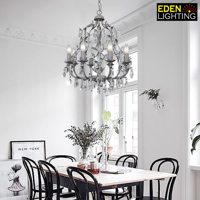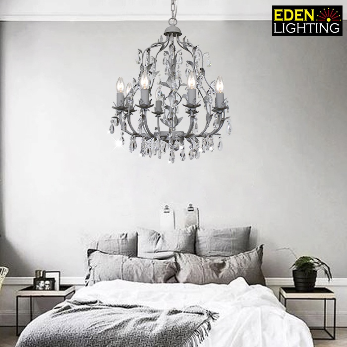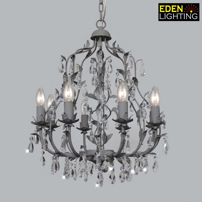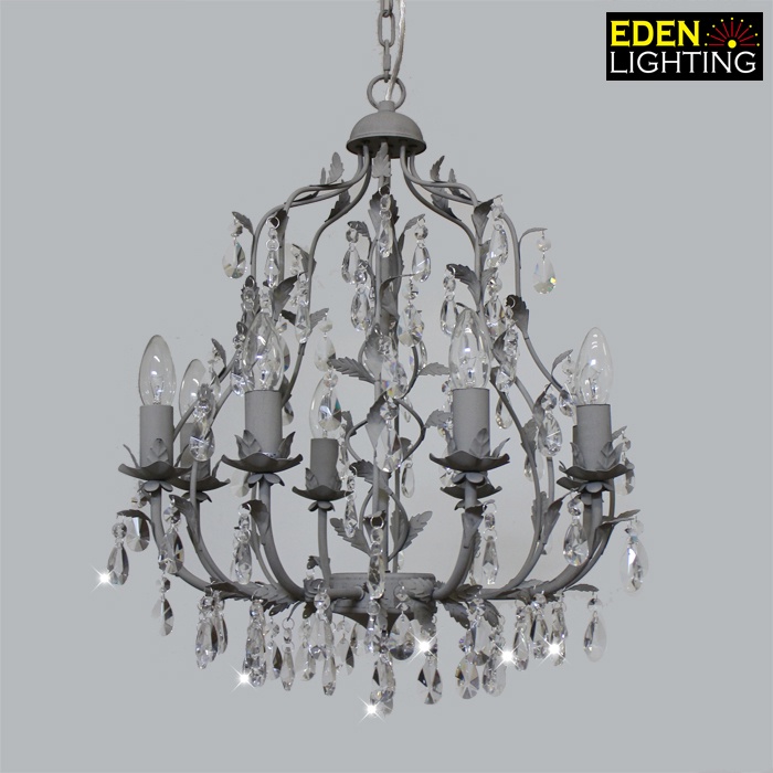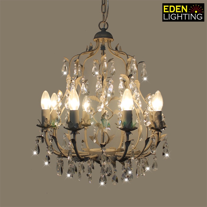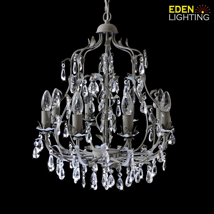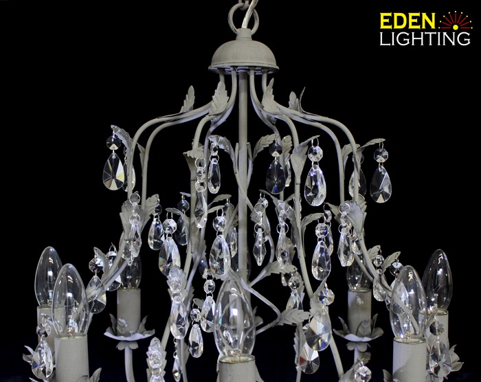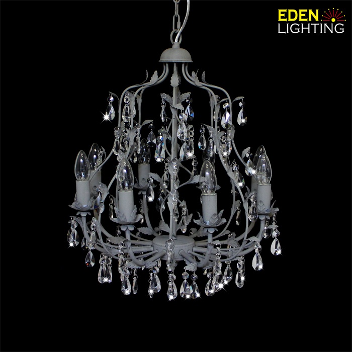 This European style chandelier will make your house a castle. Top quality crystal drops and iron leafs pattern. Available in 3 and 5 lights versions, Available in white .