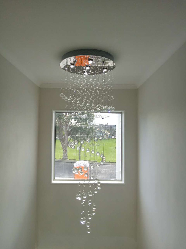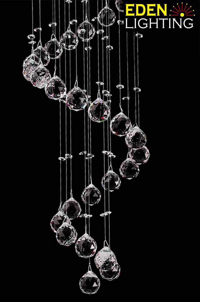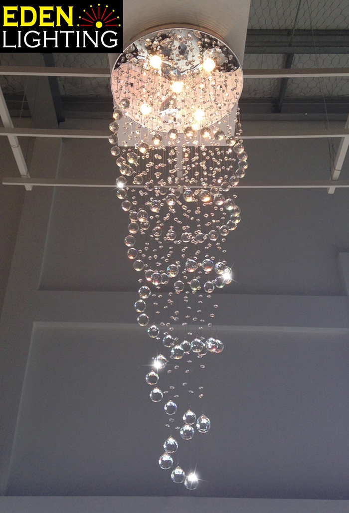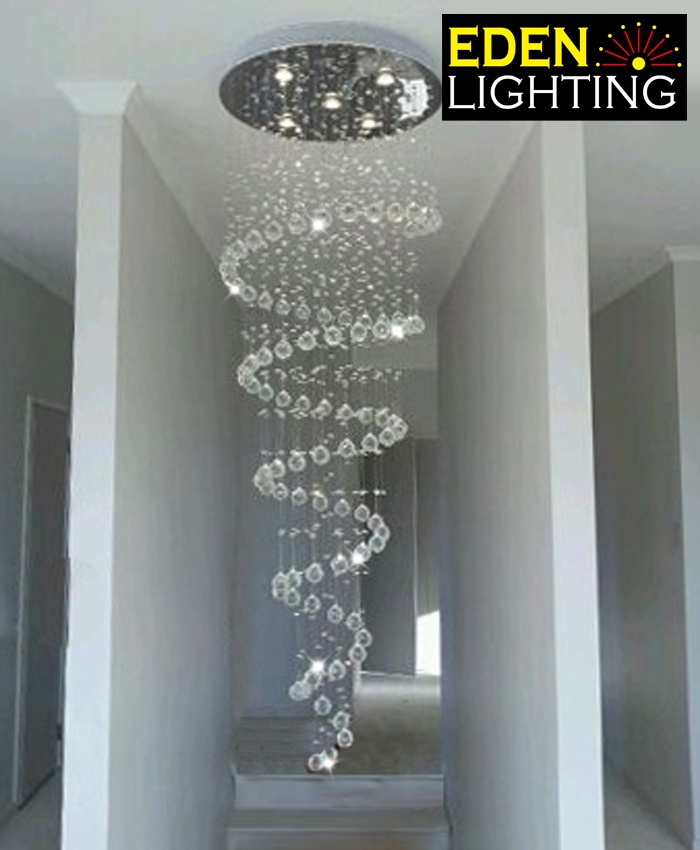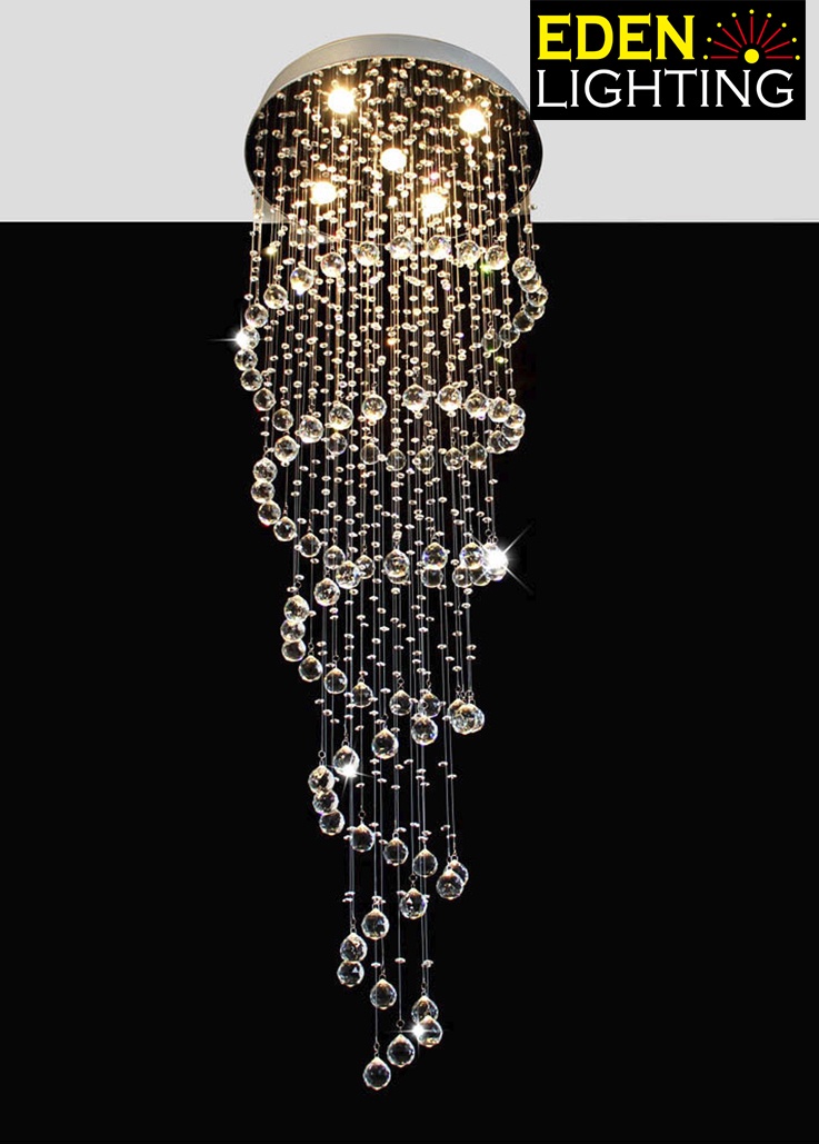 Glitter has its crystal cascades down from the ceiling fixture to create a single spiral effect. This elegant chandelier would be a great choice for stairway.