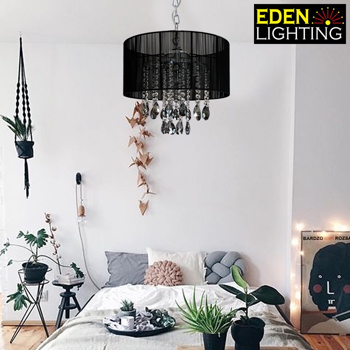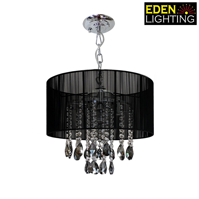 A contemporary styled chrome chandelier enclosed with Elegant hand wrapped Egyptian weaved fabric shade, polished chrome finish and high grade crystal drops. Available in two sizes and three colors. Choose from 400mm or 500mm, colored in black, white or silver.