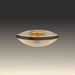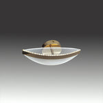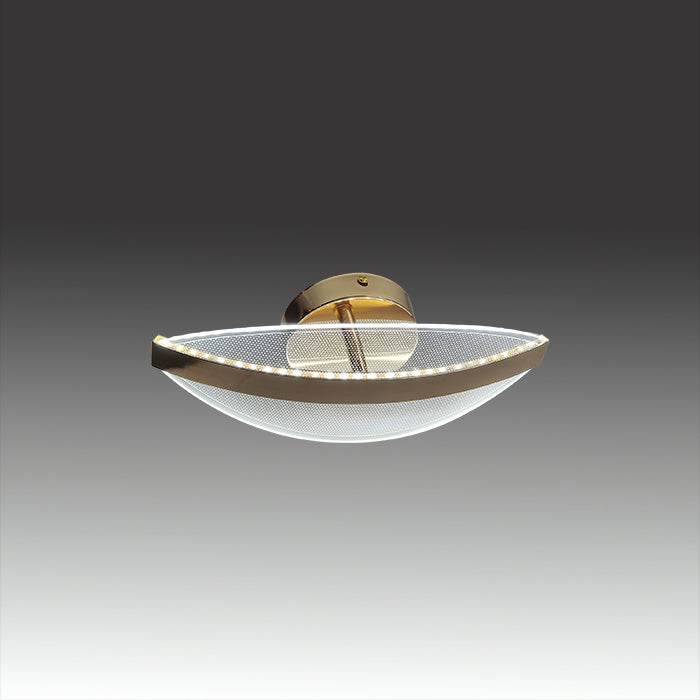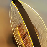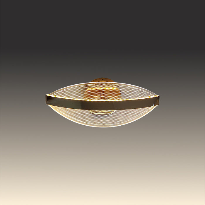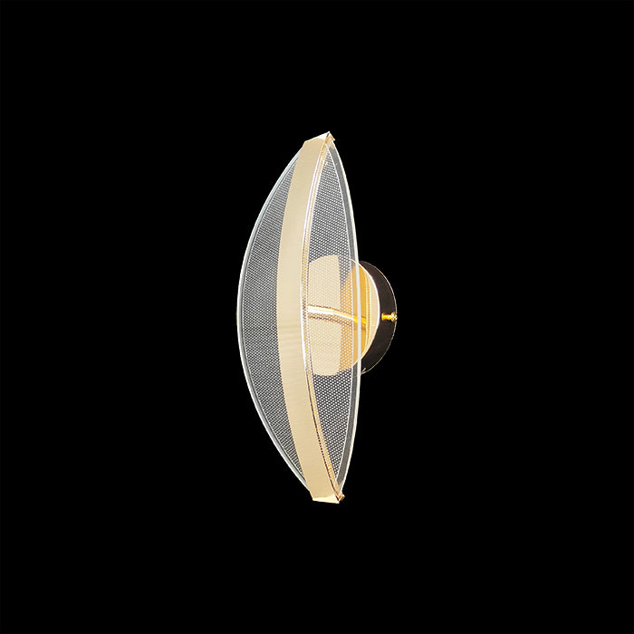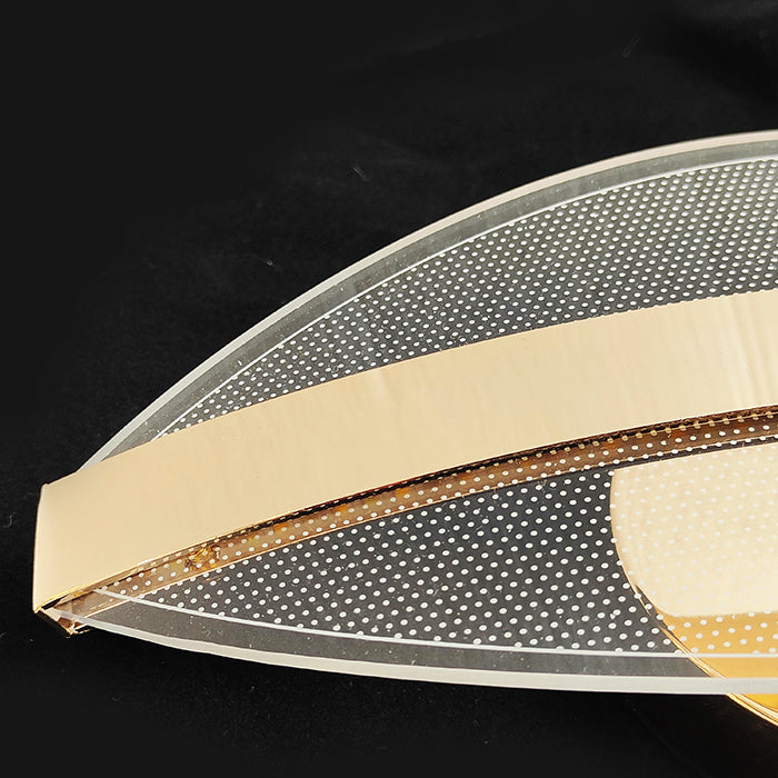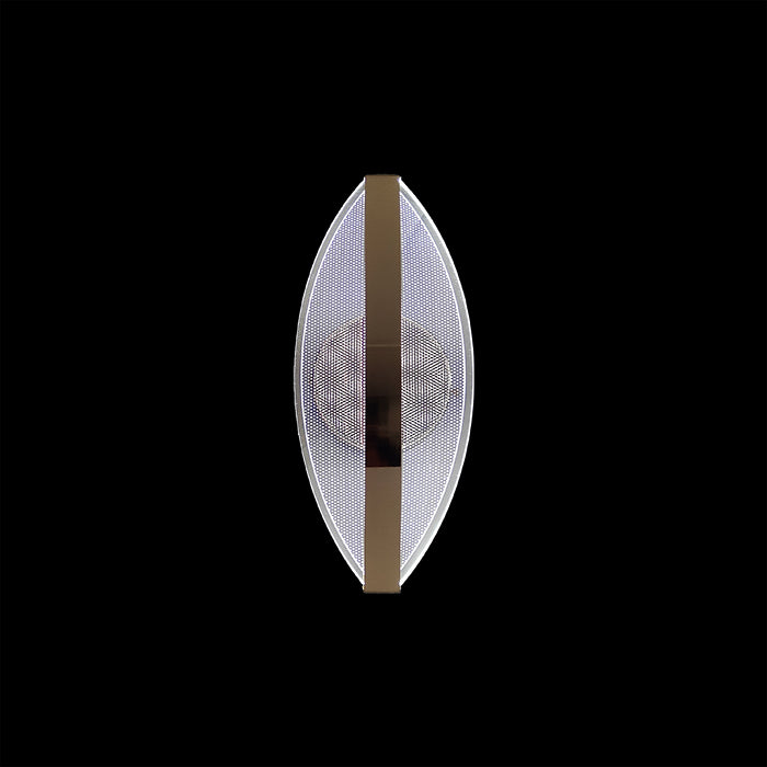 This modern wall light has a unique oval shape, made of clear acrylic with a shiny gold strip in the middle. The light emits a warm glow through the dotted surface, creating a soft and inviting atmosphere. This stylish light fixture is great for a hallway or a living room.