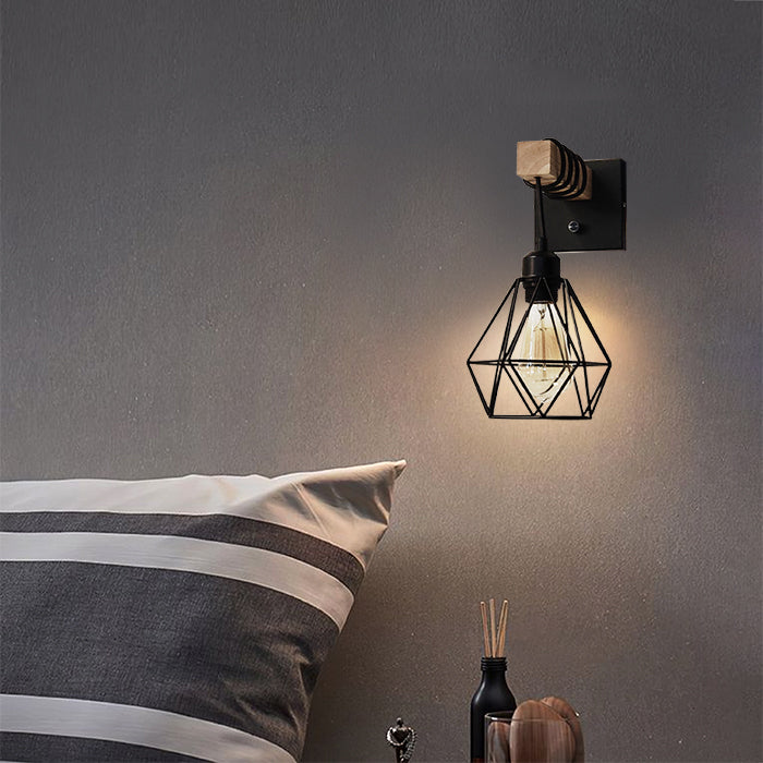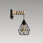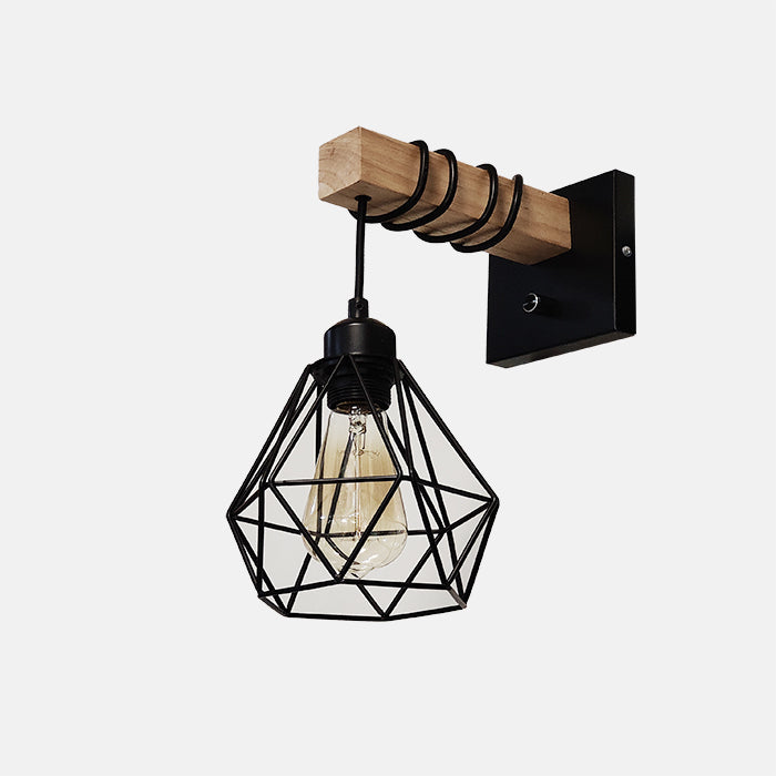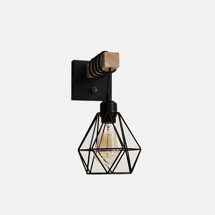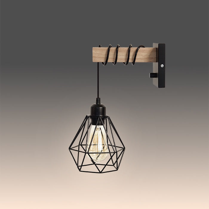 A stylish wall light with a natural wood bracket and a black geometric cage shade, perfect for adding an industrial touch to any space.