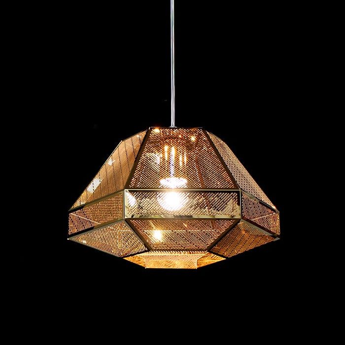 The Denica is a gold plating pendant with a highly innovative and intricate laser cut filigree motif.When lit with a clear bulb a linear pattern is washed over the walls and ceiling.  Alternatively, using a frosted light bulb will create an ambient light source.