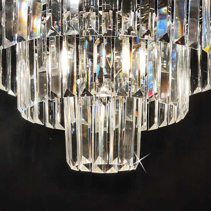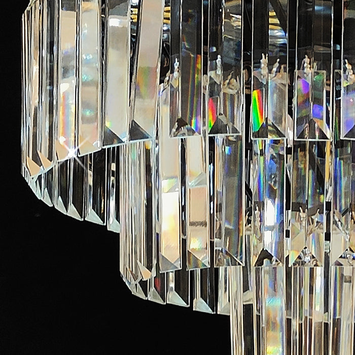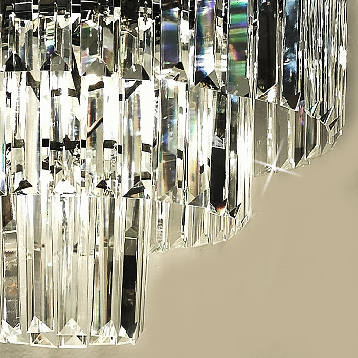 This light is luxurious, like an empire. This is two options(ceiling/pendant) chandelier finished in black metal frame, it has its shinny crystal pieces cascade down from the rounded ceiling fixture. The two echelons level enhances layer effect of the light.