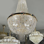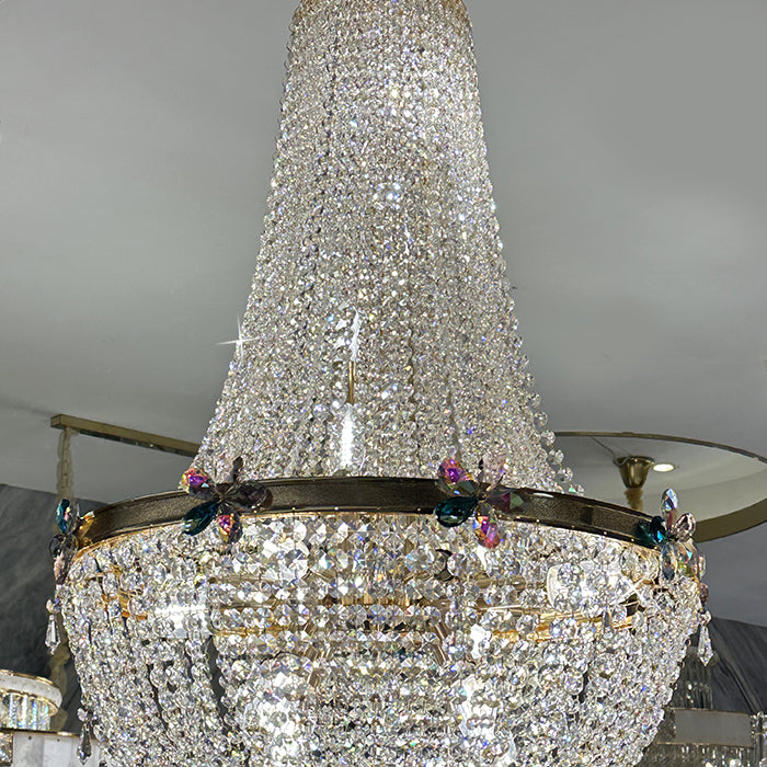 This chandelier features a golden frame with sparkling crystals. Reflecting a time of classic elegance, the empire-style chandelier's design is both luxurious and modern, making it ideal for residential or commercial spaces such as stairways or entrances.