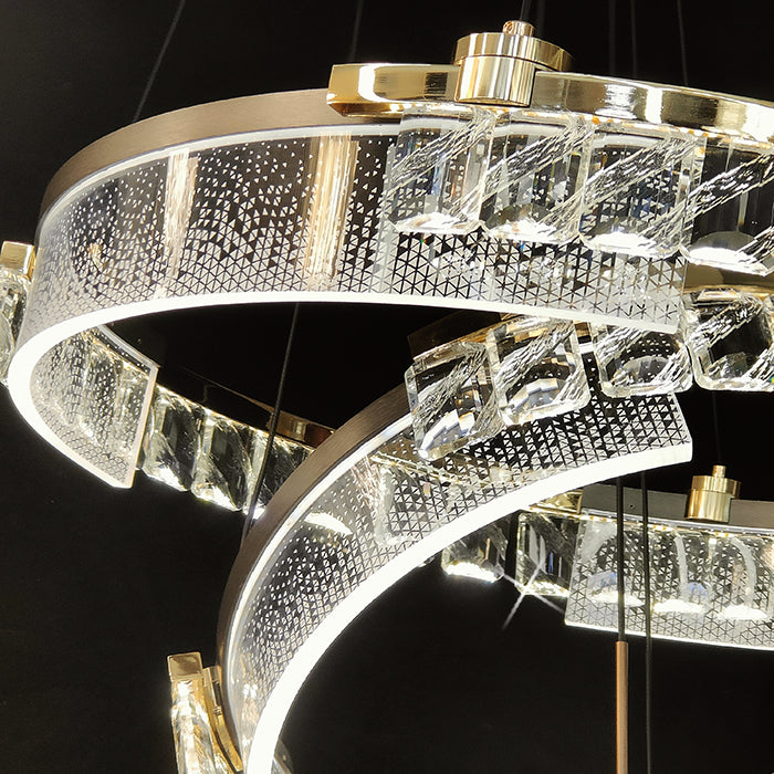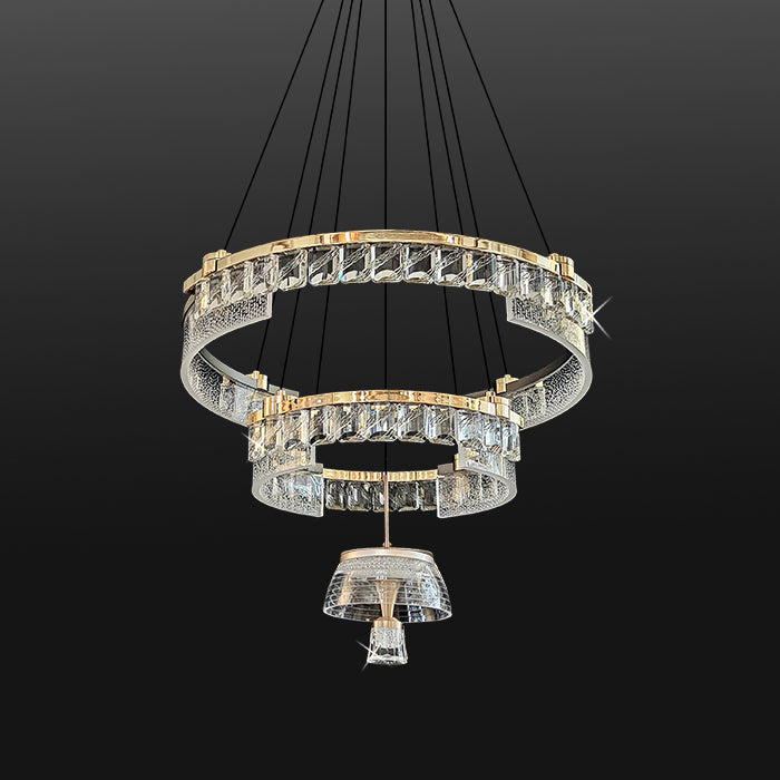 This double rings chandelier is shaped in two echelons level that enhance the layer effect. The rings are shaped in circle . And the build in LED bulbs lead these crystals shine and sparkle as diamond.  This chandelier is ideal for your stairway, dinning room, living room and entrance way.