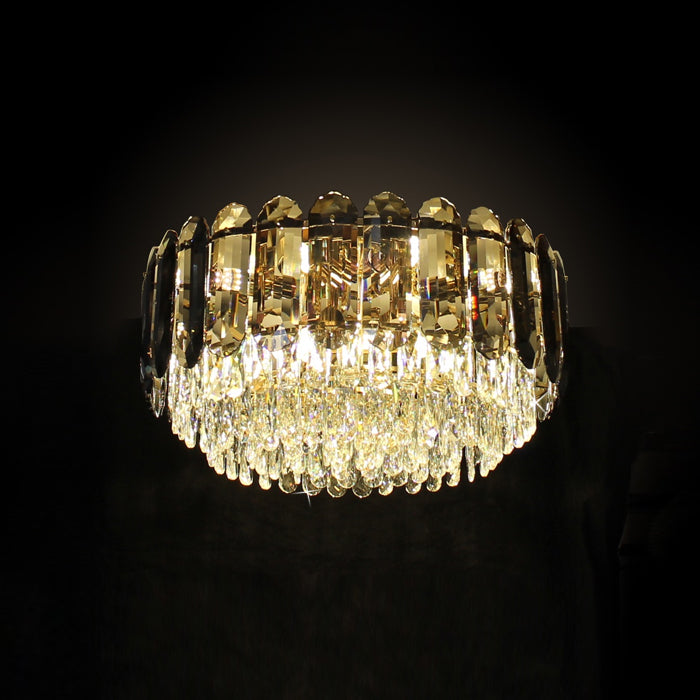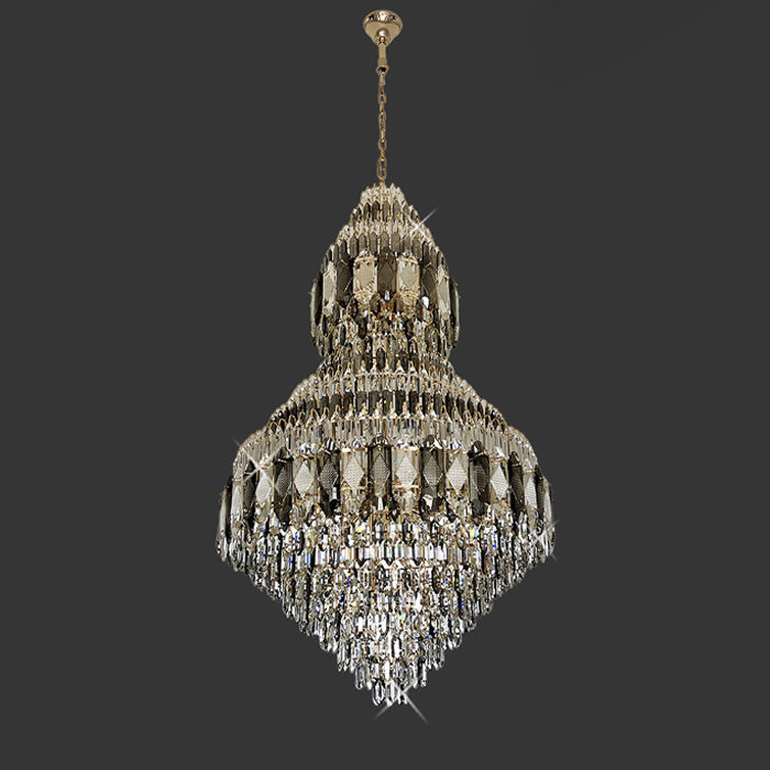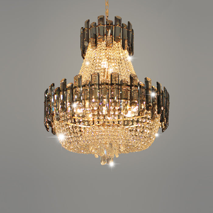 This is an empire chandelier finished in golden plated metal frame. It features with smoke rectangular crystals over the frame and large beaded crystals cascade down to the bottom. The chandelier reflects a time of classic and elegance which will surely lead to a special atmosphere in every home.