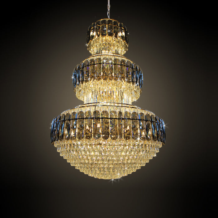 Eden is an empire chandelier finished in golden plated metal frame. It features with smoke rectangular crystals over the frame and large beaded crystals cascade down to the bottom. The chandelier reflects a time of classic and elegance which will surely lead to a special atmosphere in every home.