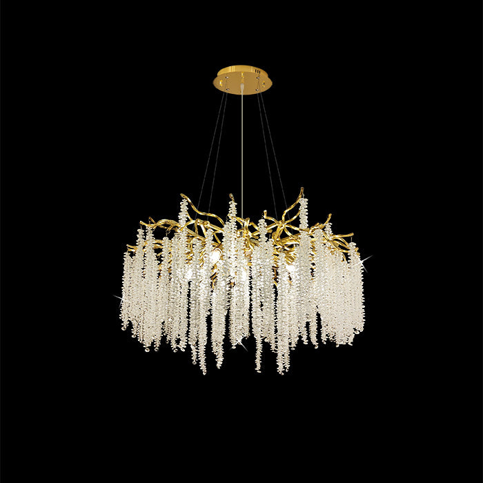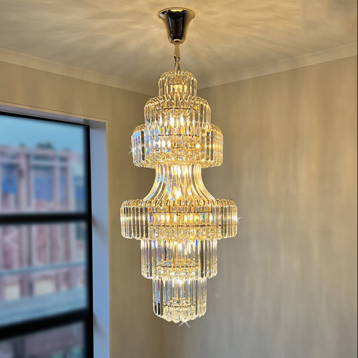This chandelier has a unique and elaborate design with a golden frame and long clear crystals hanging down, creating a curtain-like effect. This eye-catching lighting fixture would make a stunning focal point in a stairway or entrance. This design is both luxurious and modern, making it ideal for residential or commercial spaces.