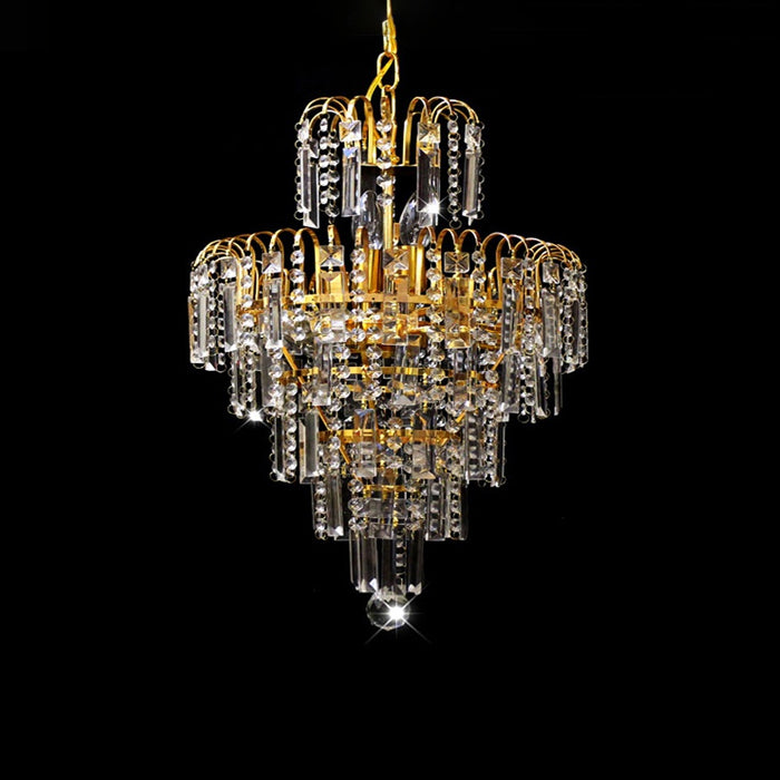 This chandelier features a unique design with multiple layers of gold metal and hanging crystals. Each layer of crystals is arranged to reflect dazzling light. This design is both luxurious and modern, making it ideal for stair way, over dinning table, breakfast bar or entrance way.