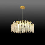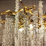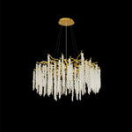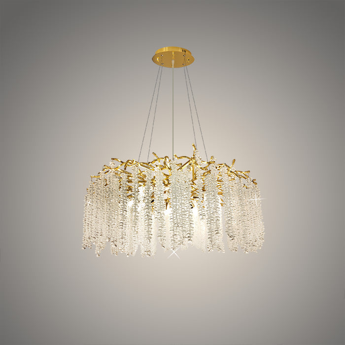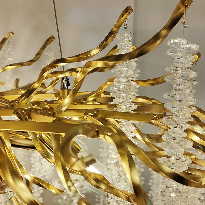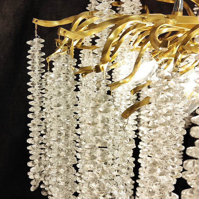 This chandelier has a unique and elaborate design with a golden frame and long clear crystals hanging down, creating a curtain-like effect. This eye-catching lighting fixture would make a stunning focal point in a stairway or entrance. This design is both luxurious and modern, making it ideal for residential or commercial spaces.