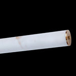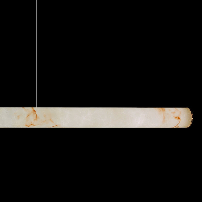 This is a modern pendant light with a long design made of marble. The light hangs from the ceiling with thin wires. It looks elegant and is good for a dining table or kitchen island.