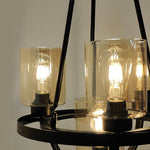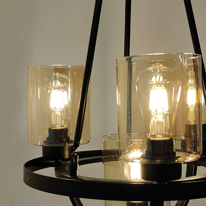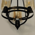 This pendant light has a black metal frame shaped like an upside-down oval with amber glass in the middle. Its industrial style fits well in modern or old-fashioned rooms like living rooms, dining areas, or hallways.