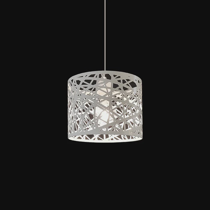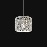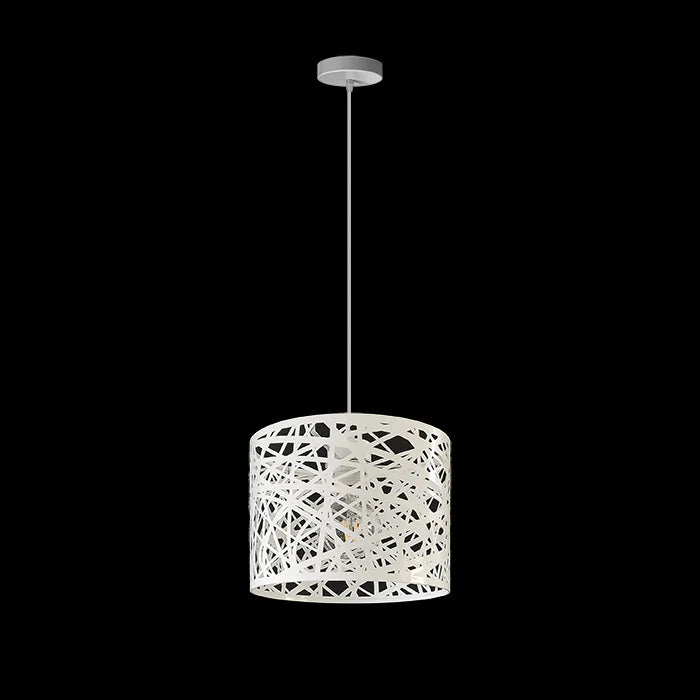 This pendant light features a patterned white metal frame with a single bright bulb inside. Its modern, stylish design is perfect for dining rooms, kitchen islands, or contemporary living spaces.