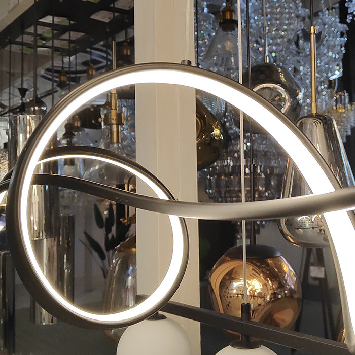 This pendant light has a wave shape with clean, modern lines. It's simple in color and design, making it great for modern rooms. This light is perfect for places like living rooms or kitchen island.