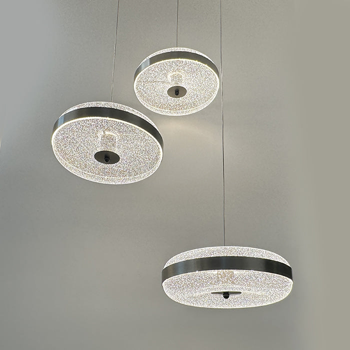 This pendant light is a modern-style chandelier composed of three lights, each suspended from a black horizontal bar. The shades are uniquely designed with a simple white circular ring. This design is suitable for a stairway or a dining table.