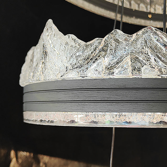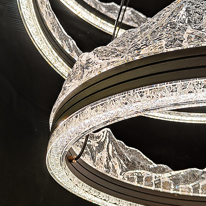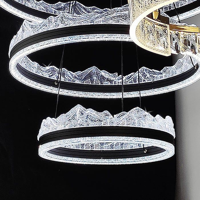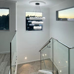This chandelier is designed with three levels, enhancing the layered effect. The rings are composed of black and white acrylic rows, and the built-in LED make the acrylic glow. You can also adjust the wires of this chandelier to create different styles or shapes, such as parallel lines or hanging them at various heights as shown in the above picture. This chandelier is perfect for your stairway, dining room, living room, and entrance way.