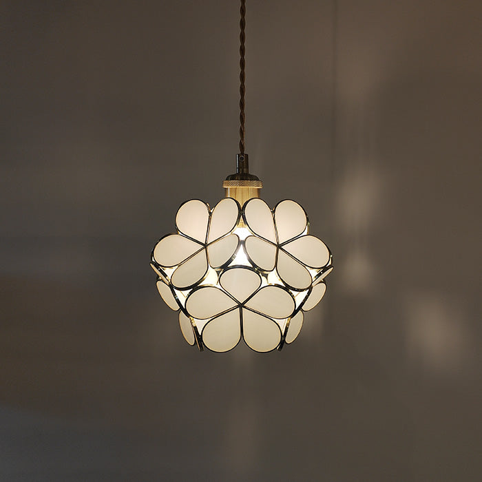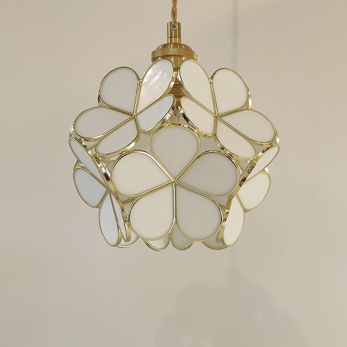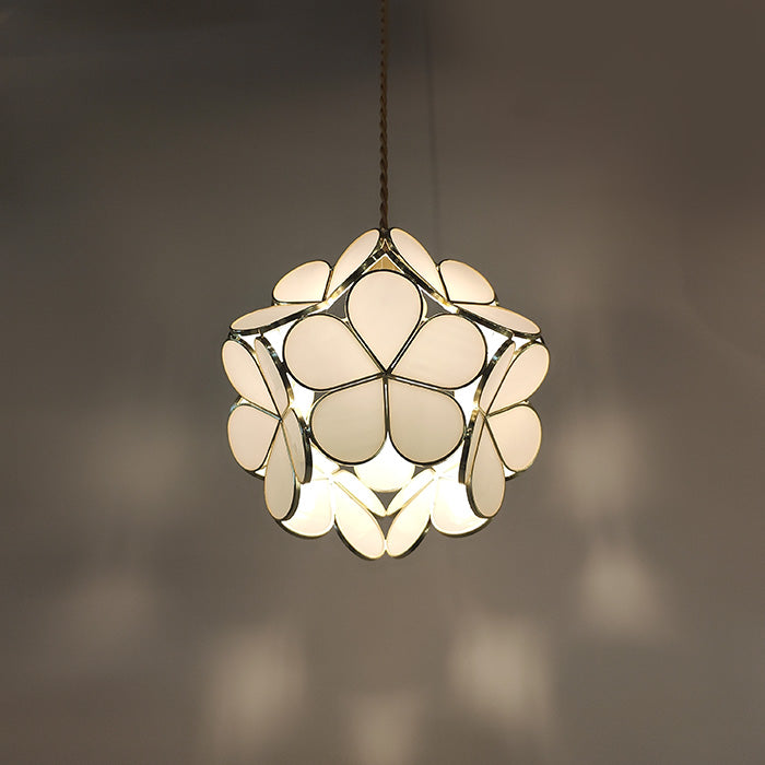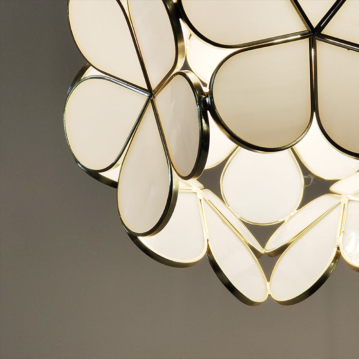 This light is made of glass and metal and has many pieces shaped like leaves, which are light white and have a textured surface. The leaves are arranged in a flower-like pattern around the light bulb. The metal parts are golden, adding a shiny touch. ideal for living room or hallway.