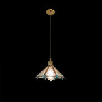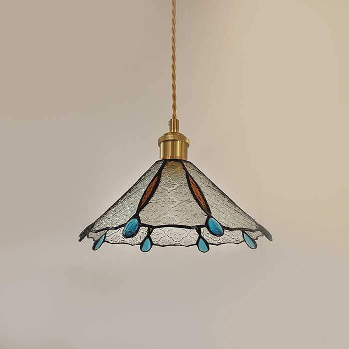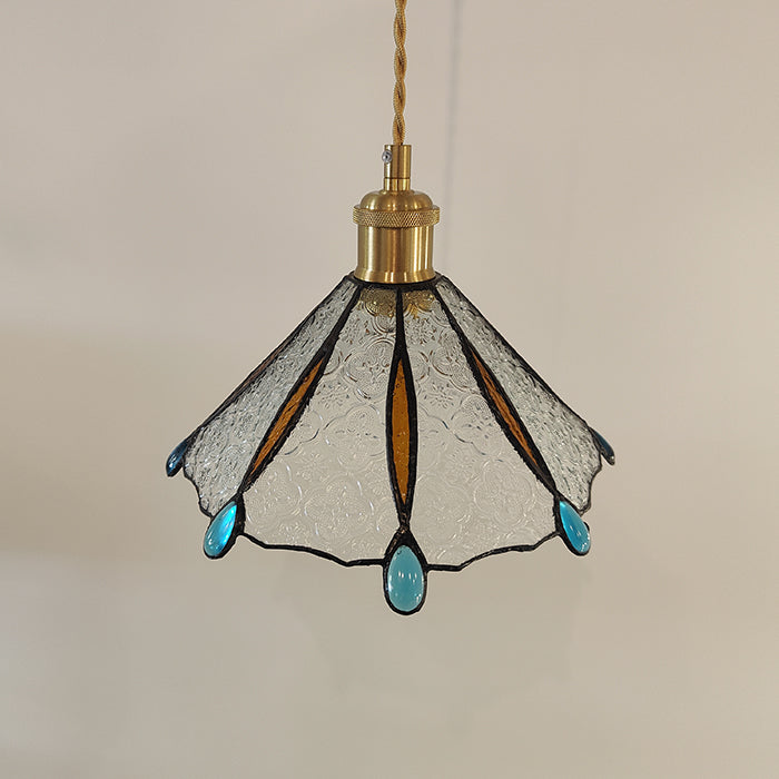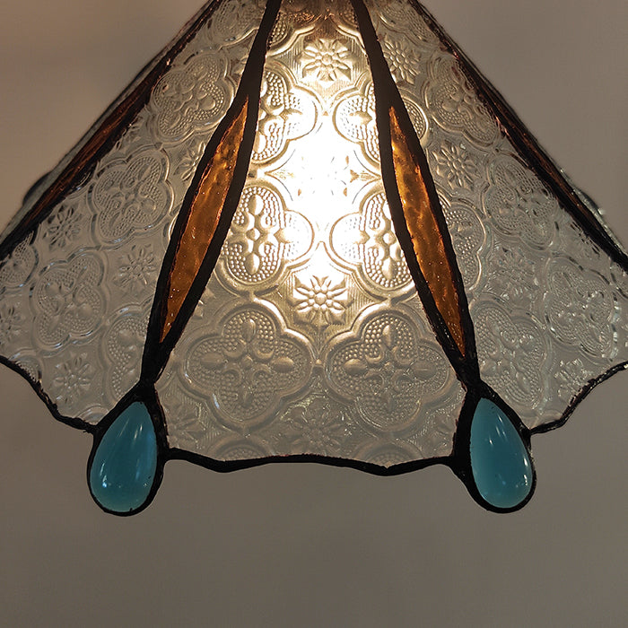This light is a stained glass shade with creamy white, orange and blue accents. The edges are outlined in black, and there are teardrop-shaped blue glass pieces hanging at the points. This type of light adds a colorful and vintage look to any room. It's perfect for living room or bedroom.