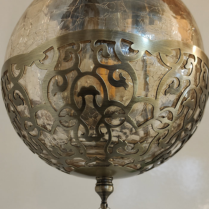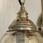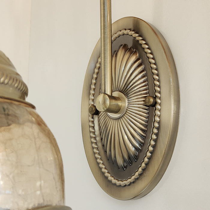 This wall light is a vintage design and features a curved brass arm and a round glass shade that has a cracked texture. The shade is decorated with a dark metal frame. A small decorative piece hangs from the bottom of the shade. perfect for a hallway or an entrance.