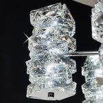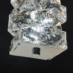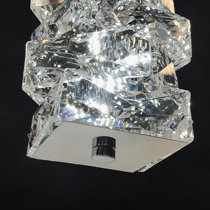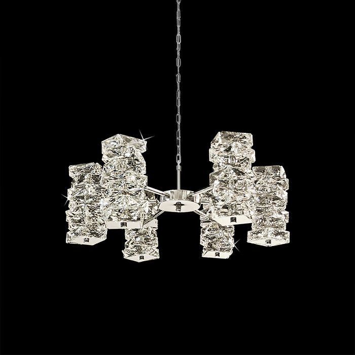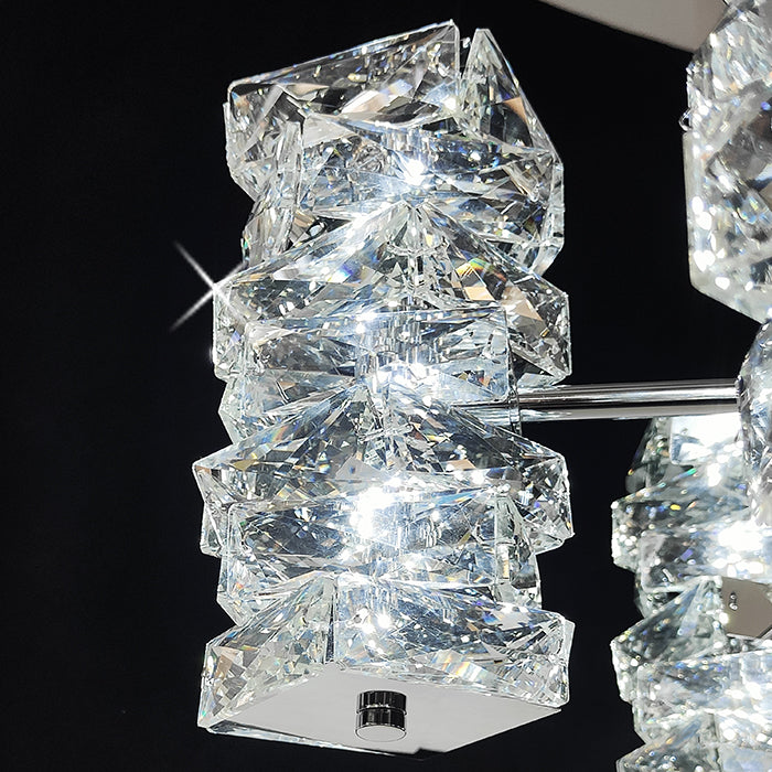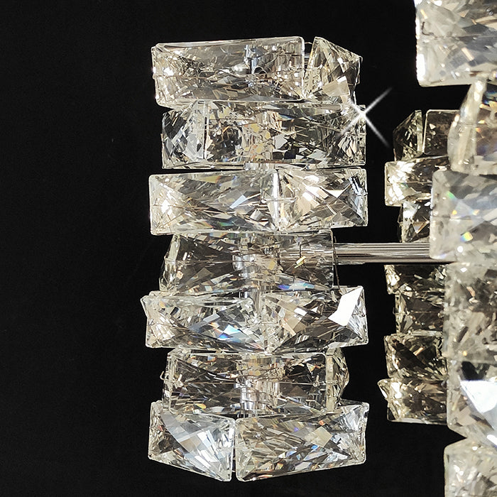 This is a modern chandelier with a gold frame and crystal lights. The design is stylish and elegant, and the light shines through the crystals, creating a sparkling effect. This chandelier is perfect for a stairway or entrance.