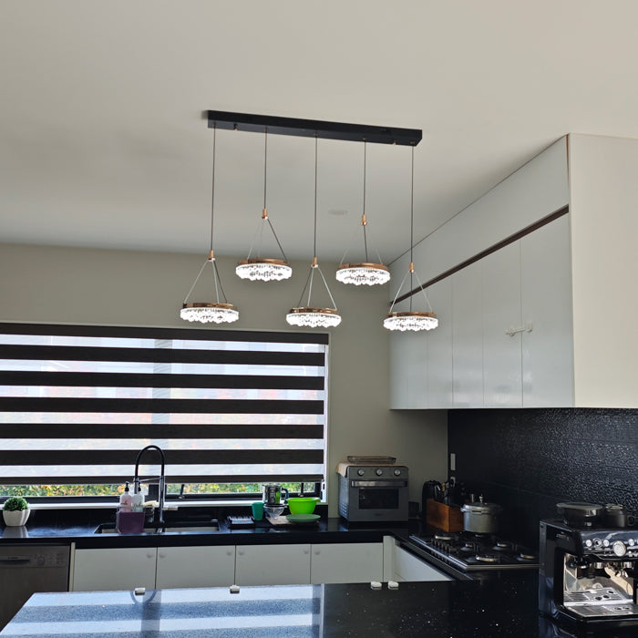 LED Pendant light Color change Brass color 51055-5, this energy-efficient, elegant five pendants hanging chandelier features adjustable height and glowing acrylic, ideal for enhancing modern interiors.