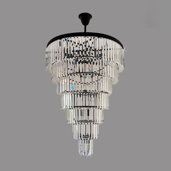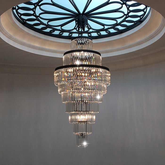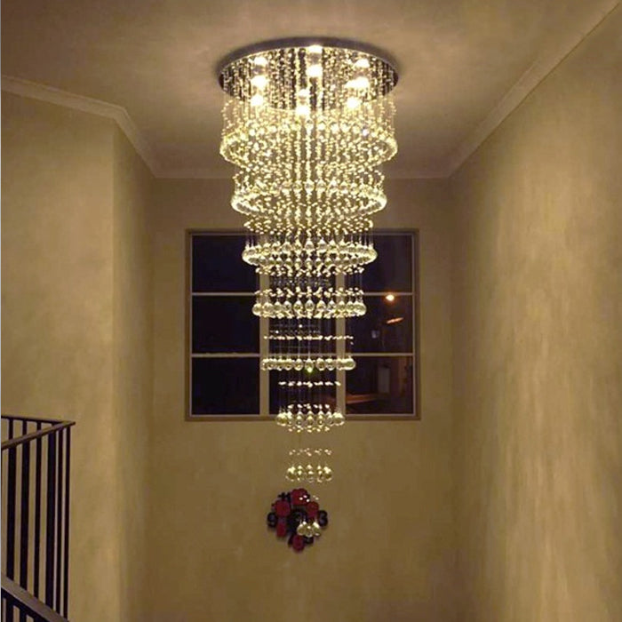 This is a modern chandelier with a gold frame and crystal lights. The design is stylish and elegant, and the light shines through the crystals, creating a sparkling effect. This chandelier is perfect for a stairway or entrance.