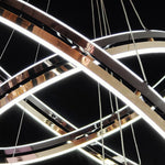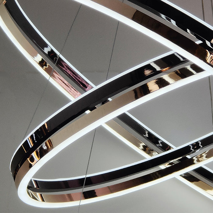 This chandelier is designed with three levels, enhancing the layered effect. The rings are composed of black and white acrylic rows, and the built-in LED  make the acrylic glow. You can also adjust the wires of this chandelier to create different styles or shapes, such as parallel lines or hanging them at various heights as shown in the above picture. This chandelier is perfect for your stairway, dining room, living room, and entrance way.