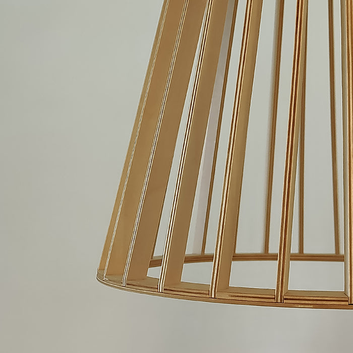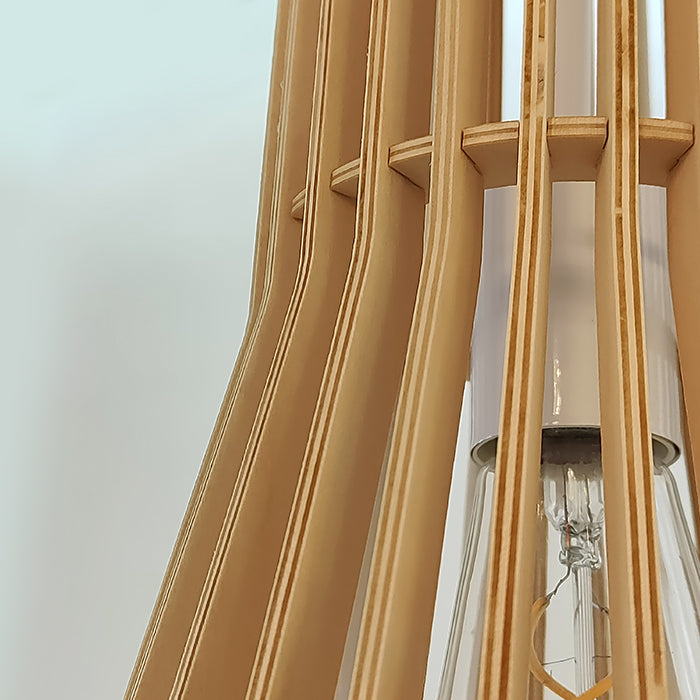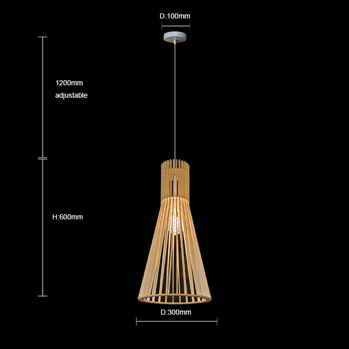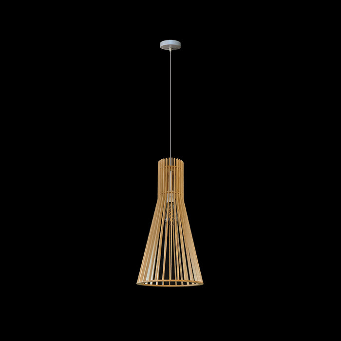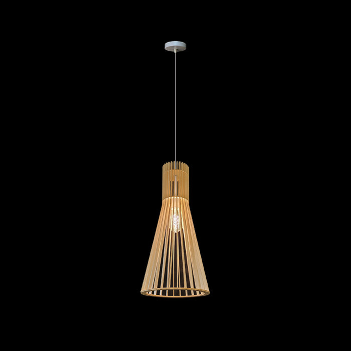 This is one of our popular wooden collection pendants, it is designed in cone shade with see through cut. With its narrow and long design, it is ideal feature light for kitchen, bedroom and hallway.