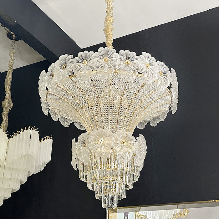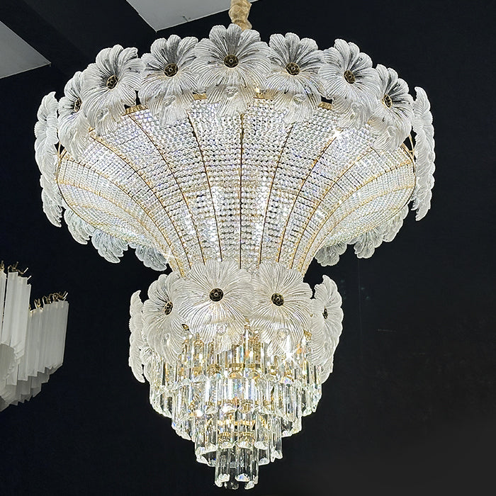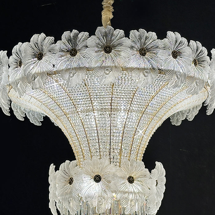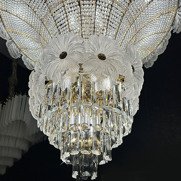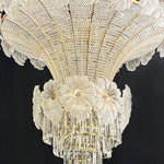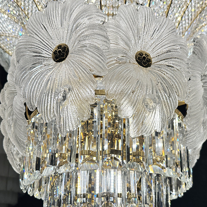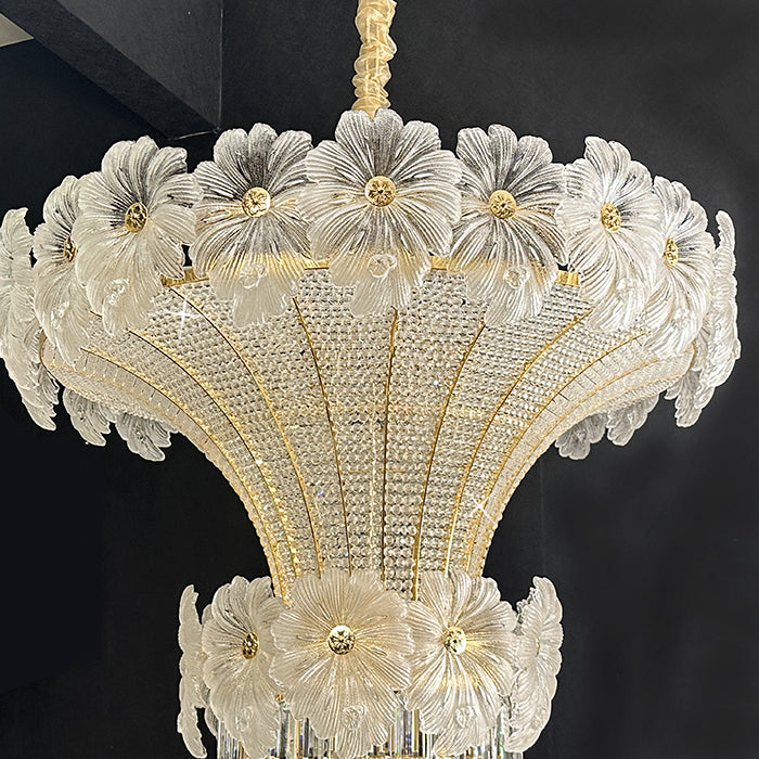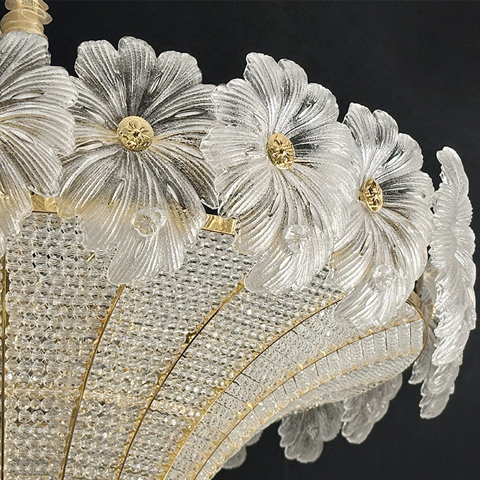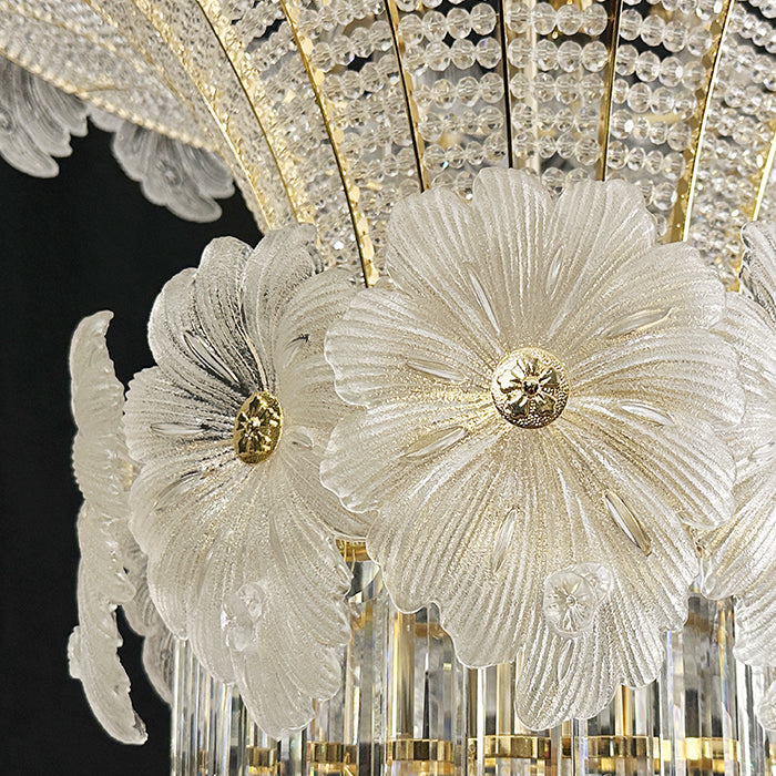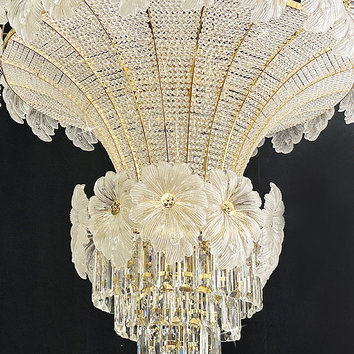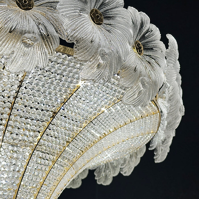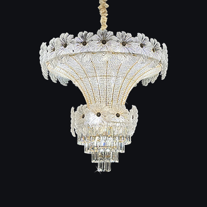 This pendant light is an empire chandelier finished in a golden-plated metal frame with crystals. It features flower crystals around the frame and additional crystals at the bottom. The chandelier reflects a time of classic elegance which will surely create a special atmosphere in every home, ideal for a stairway, entrance, or dining table.