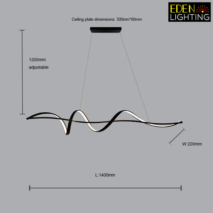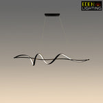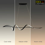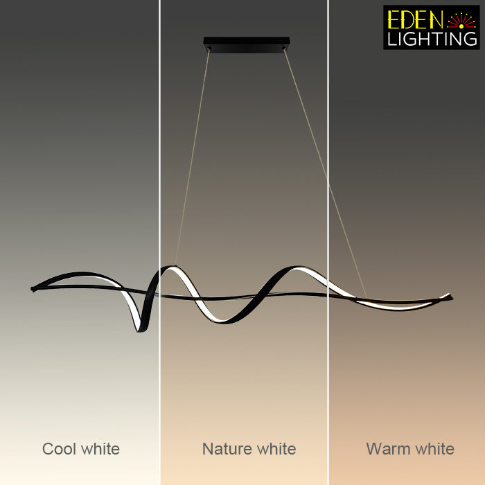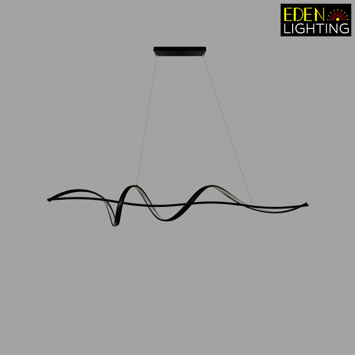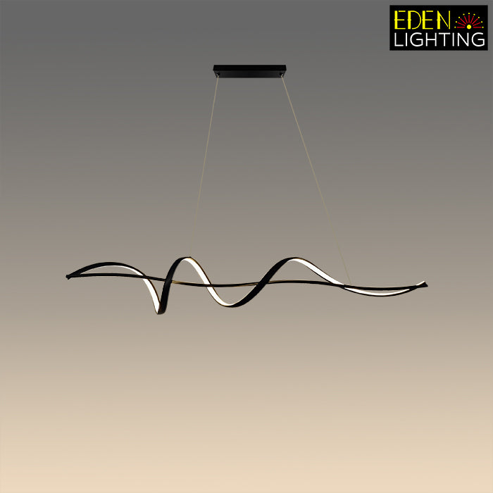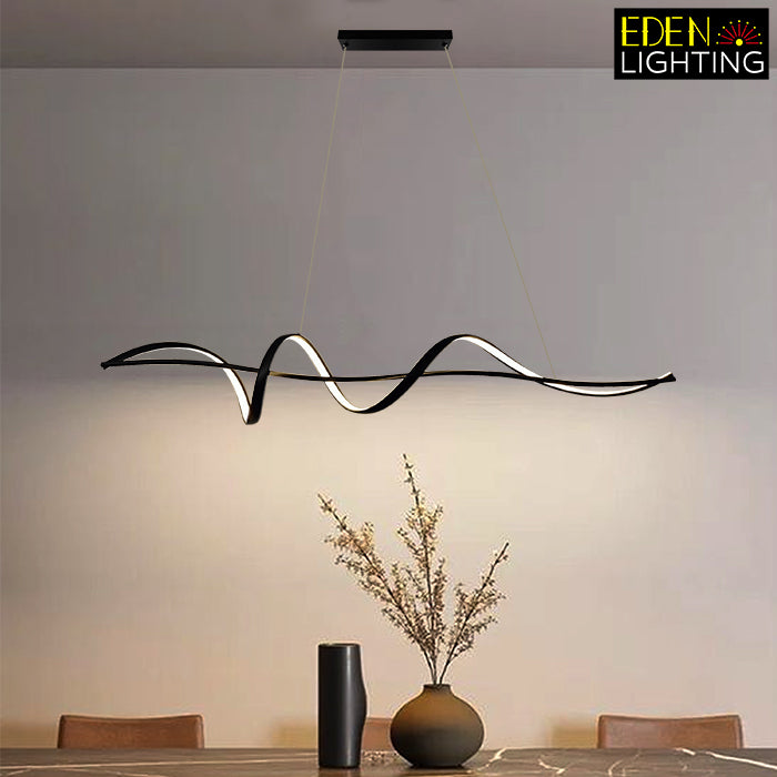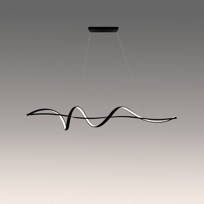This pendant light has a wave shape with clean, modern lines. It's simple in color and design, making it great for modern rooms. This light is perfect for places like living rooms or kitchen island.