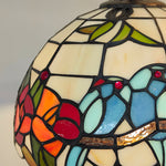 Unit price perTiffany Pendant light 9026/1,this elegant pendant features stained glass patterns inspired by the blue-green Tui bird and the vibrant NZ Flame Pea flower. A beautiful blend of nature and vintage style, designed to bring warmth and colour to your interior.