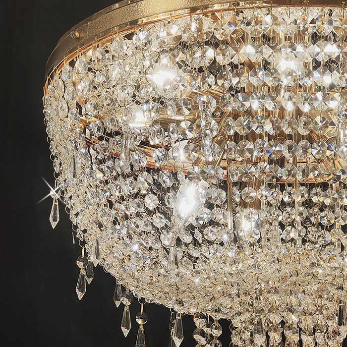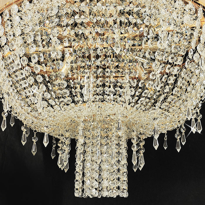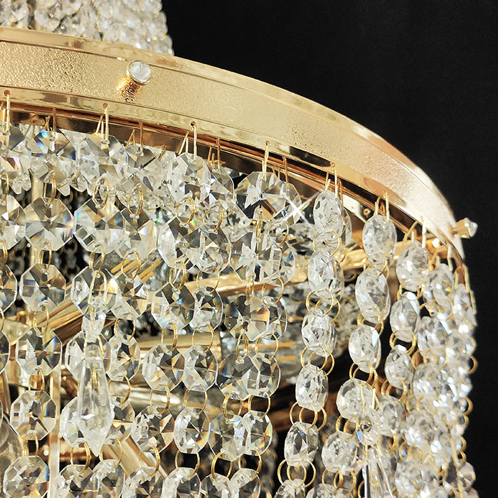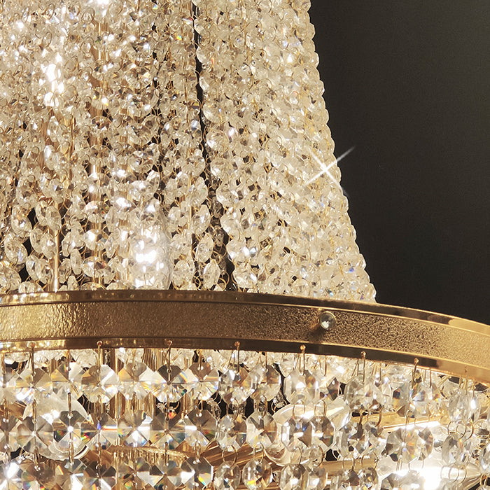 This chandelier features a golden frame with sparkling crystals. Reflecting a time of classic elegance, the empire-style chandelier's design is both luxurious and modern, making it ideal for residential or commercial spaces such as stairways or entrances.