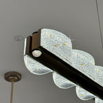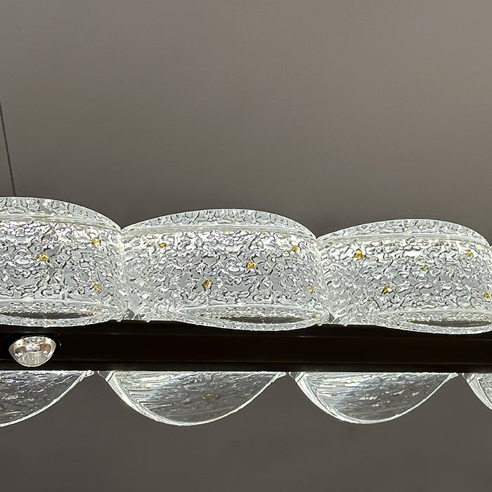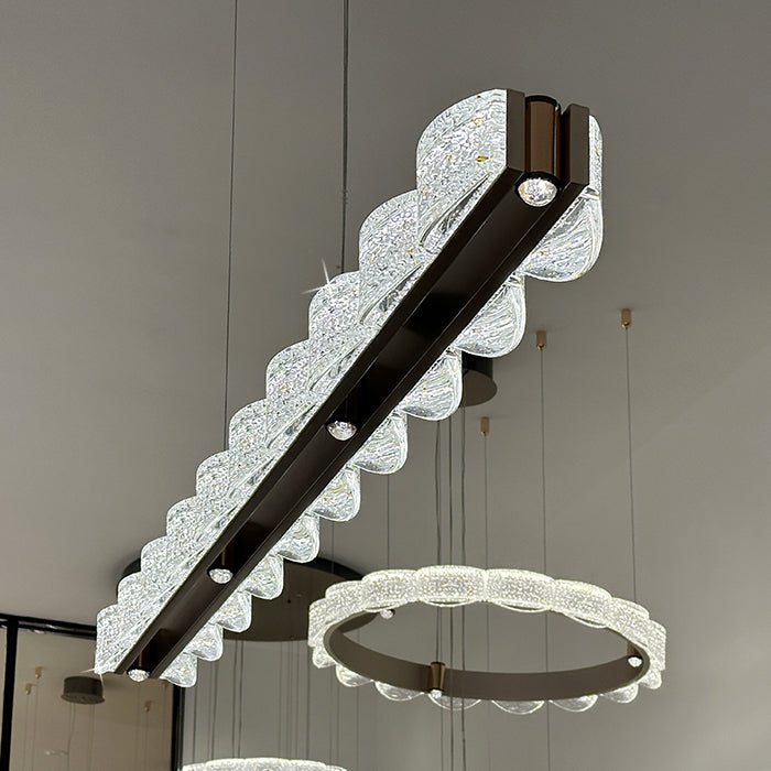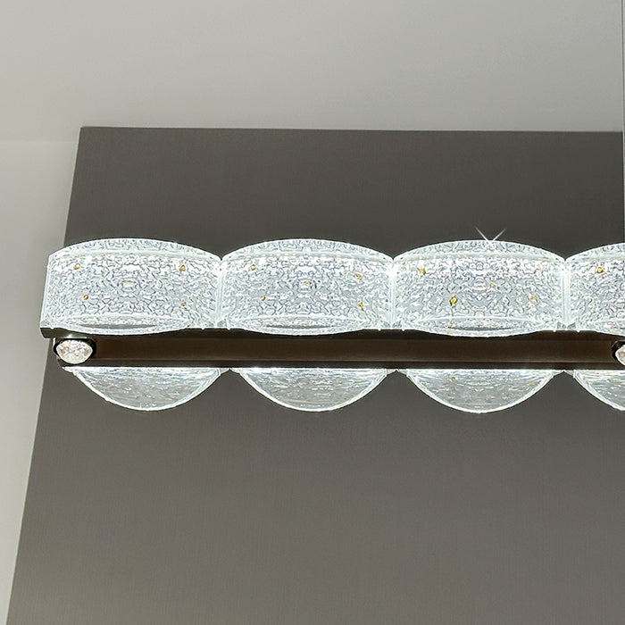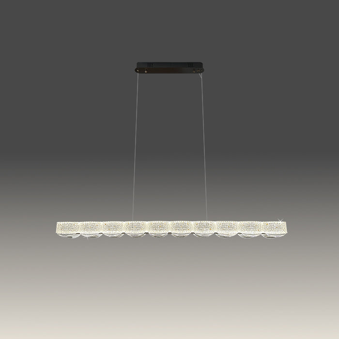 This is a modern pendant light with a long design made of clear acrylic. The light hangs from the ceiling with thin wires. It looks elegant and is good for a dining table or kitchen island.