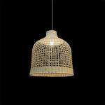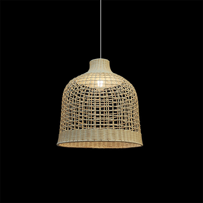 This light is made of bamboo. It has a wide, bell-shaped top and a round bottom. The lamp is woven in a way that you can see through it, which creates a nice pattern of light and shadow. The natural color of the bamboo adds a warm and earthy feel. great for living room or dining table.