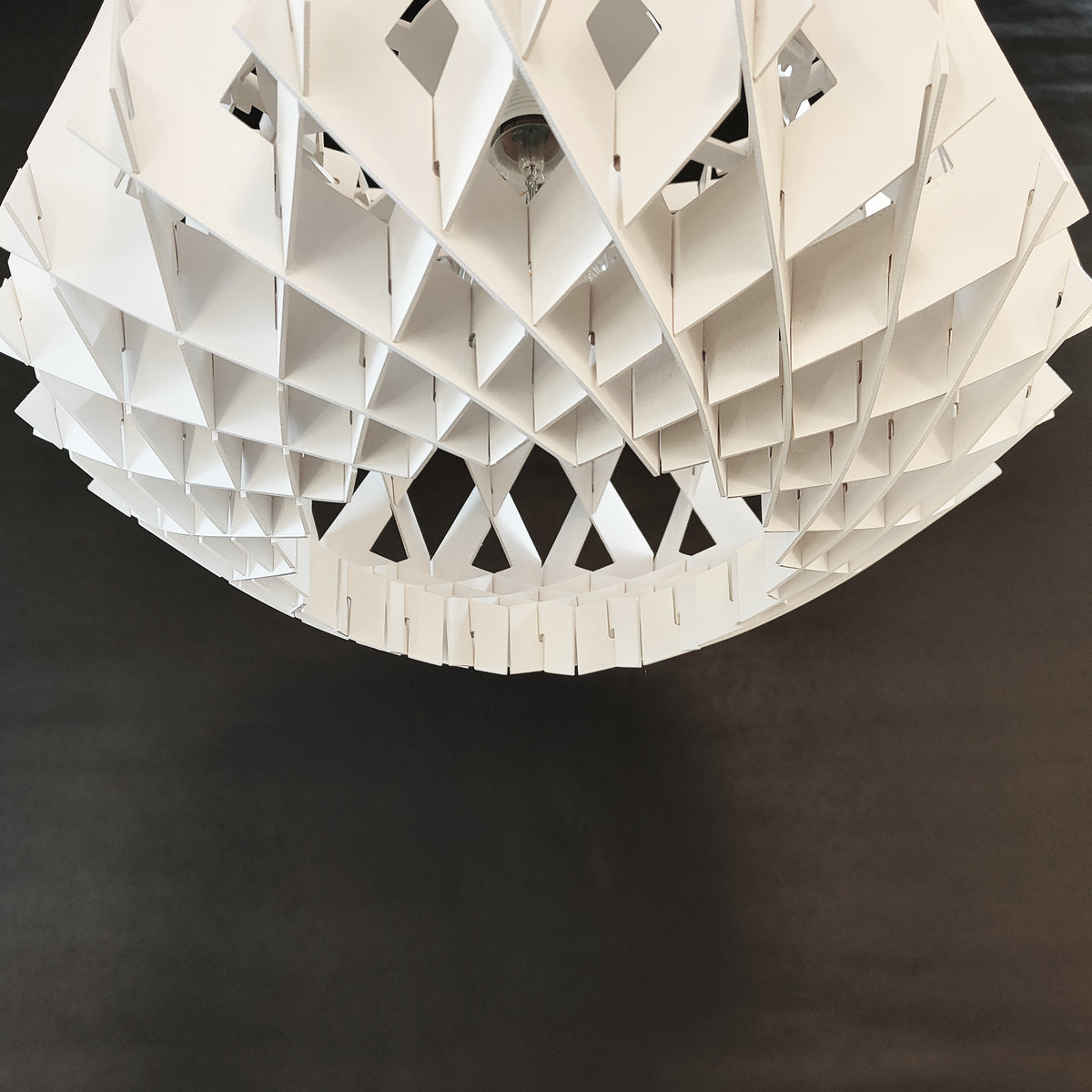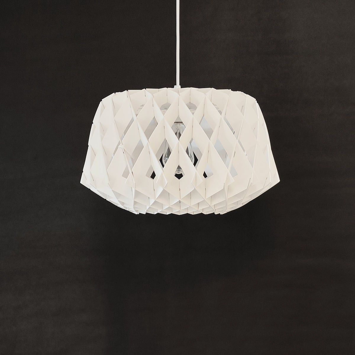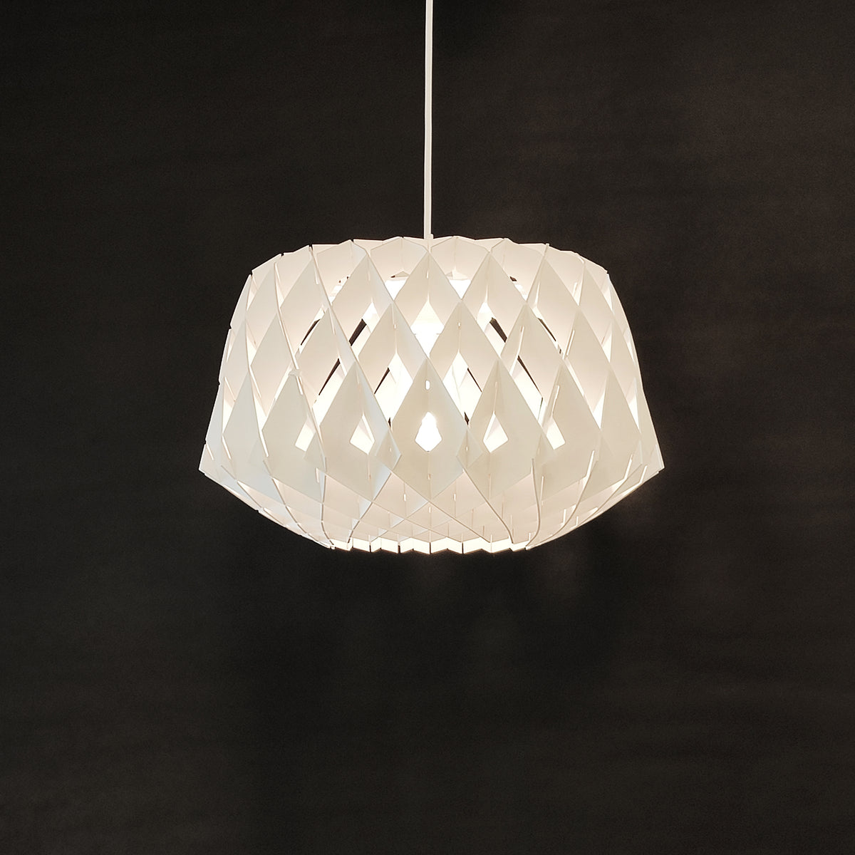This light is one of our most popular wooden collection pendants, made of plywood and designed in a diamond shape. The cross-cut design adds an exquisite detail to this gorgeous pendant. It is available in three colors: natural wood, black, and white.