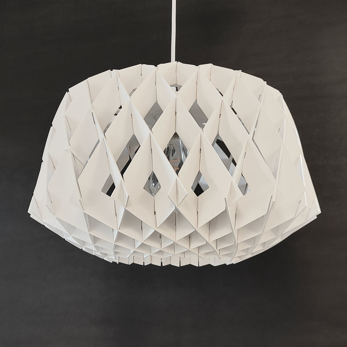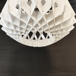 Unit price perPendant Light White Wooden Wood02-400mm, this natural material lighting features a modern diamond-shaped design made of plywood, ideal for New Zealand home decor.
